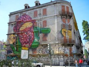 Ráno jsme jako první vyrazili do ulice Avenida Fontes Pereira de Melo. Ukázalo se totiž, že v Lisabonu působí streetartové duo Os Gêmeos (Dvojčata), a tak jsme chtěli vidět, co zas pěkného posprejovali. Tentokrát se vtipně strefovali do zlých bohatých ropných společností vysávajících matičku Zemi.